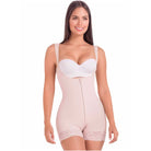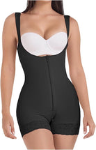 The 9831 MariaE is a mid-thigh length garment made of Powernet, one of the best control fabrics available. It has a front flat zipper with an inner hook-and-eye closure that goes unnoticed under any outfit. Special silicone lace bands around the thighs prevent roll-ups or bunching. Powernet coupled with cotton lining and a complex Vitafit release of natural ingredients moisturizes, lifts, and shapes the butt. The high compression and thin straps give you the perfect silhouette.